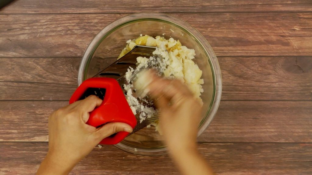 Mash the peeled bananas and mix with grated potatoes.