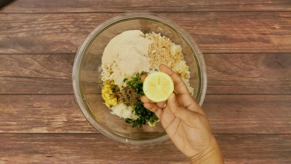 For binding, add rajgira flour and peanut powder. Add grated ginger, chopped green chilis, chopped coriander, cumin powder, black pepper powder, rock salt and lemon.