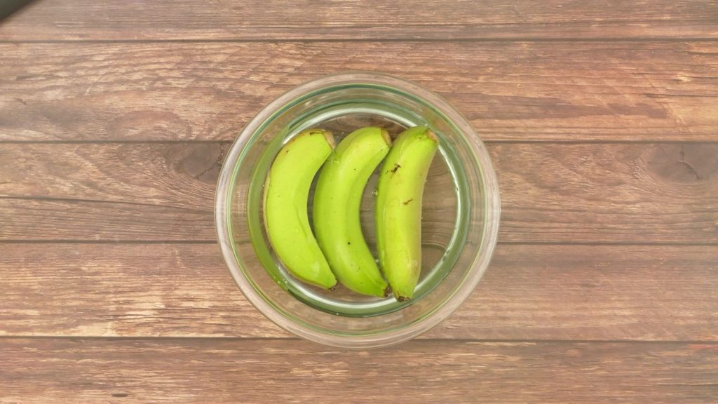 Microwave three raw bananas in water for five minutes or until just cooked. Avoid overcooking the bananas.