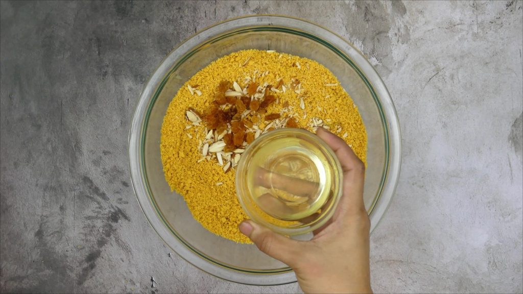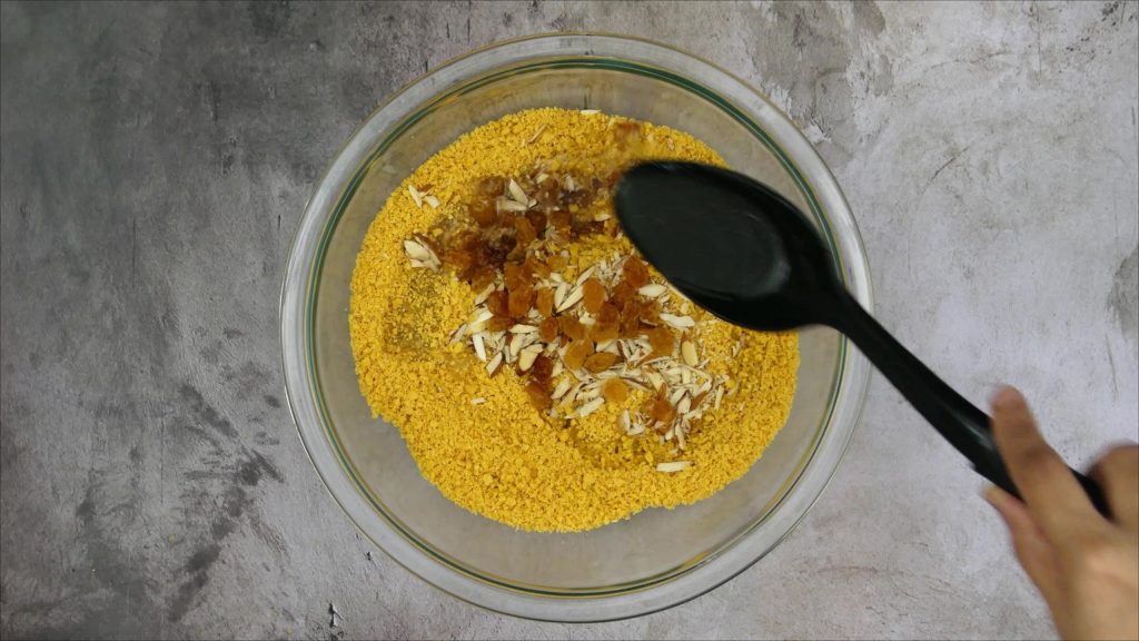 Step 6: Add chopped almonds, raisins and hot ghee in it. Add prepared sugar syrup as needed(Generally it took full quantity syrup). Mix everything well. Let it rest for 1 to 2 hours so that sugar syrup will absorb nicely. Do not cover the mixture.
