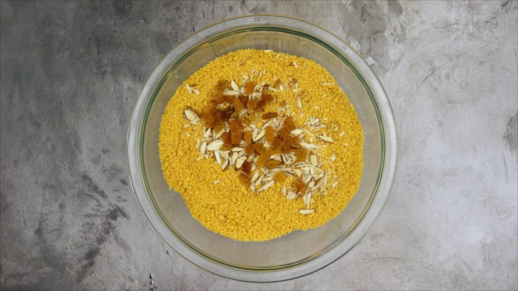 - Add chopped almonds, raisins and hot ghee in it.