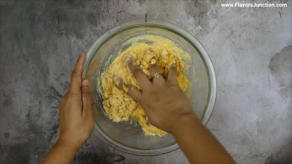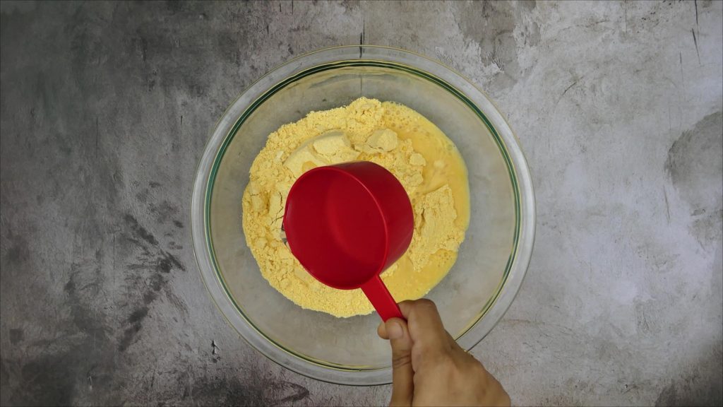 Step 1: In a bowl, add 2 cups of coarse gram flour(Laddu besan), add water and knead medium soft dough. Cover and let it rest for at least 15 minutes.