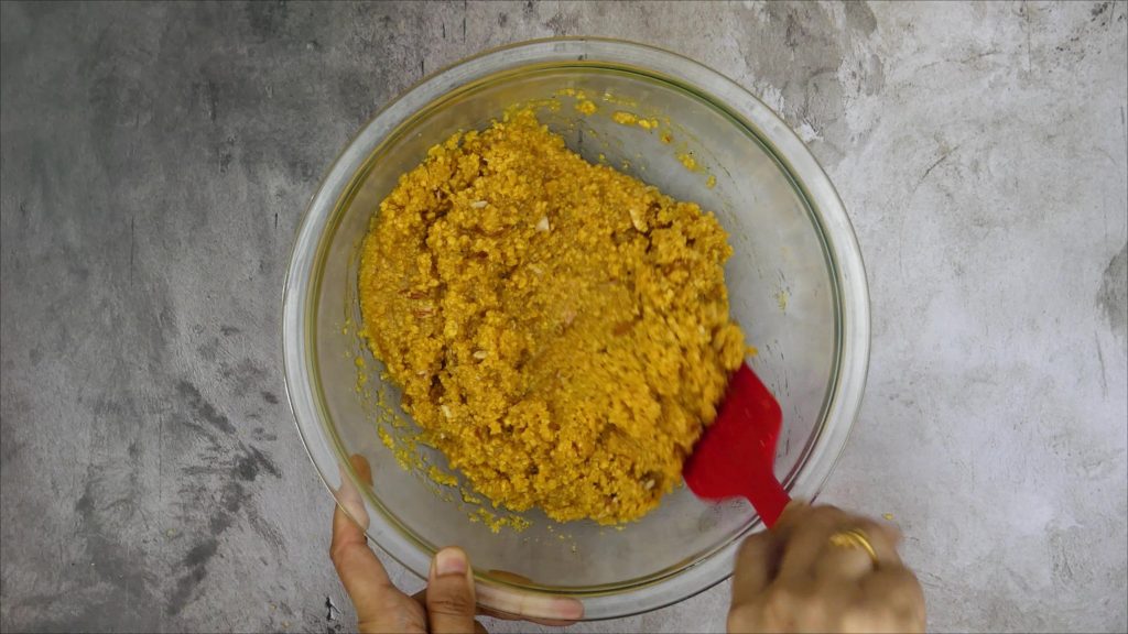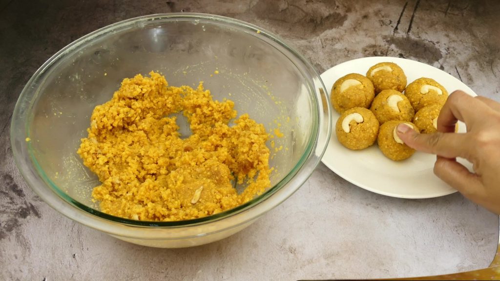 - After adding sugar syrup, resting is very important step, Give it good rest until you can see the mixture is dry and easily bind into laddu.
