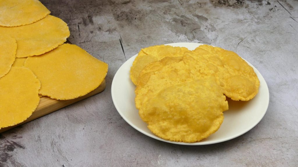 - Fry the prepared besan puri into medium hot ghee, fry it on medium flame from both sides until nice golden in color. Fry the remining and keep them aside.