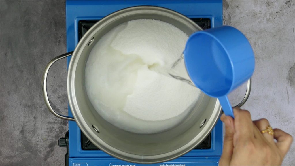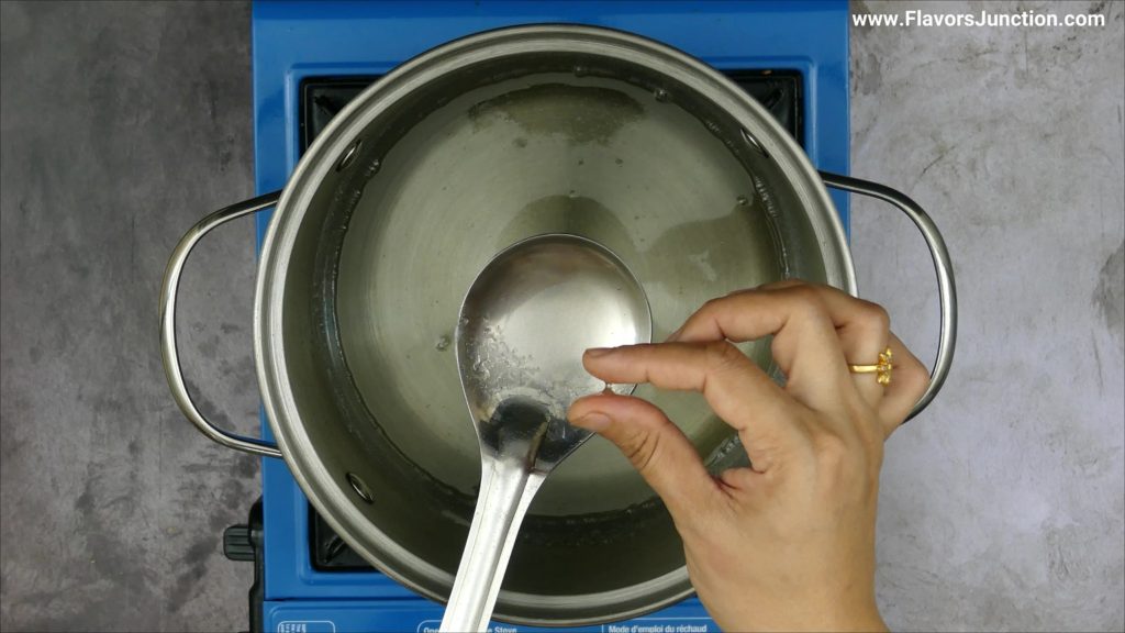 - In a saucepan, add 2 cups of sugar and 1 cup of water. Mix it and keep it boiling until sugar is dissolved and the syrup is of one string consistency . To check the consistency, touch the syrup with finger and then touch the finger to thumb, gently pull apart. If the syrup forms a single thread without any break, then one string consistency syrup is ready. Turn off the flame immediately, do not over cook the syrup.