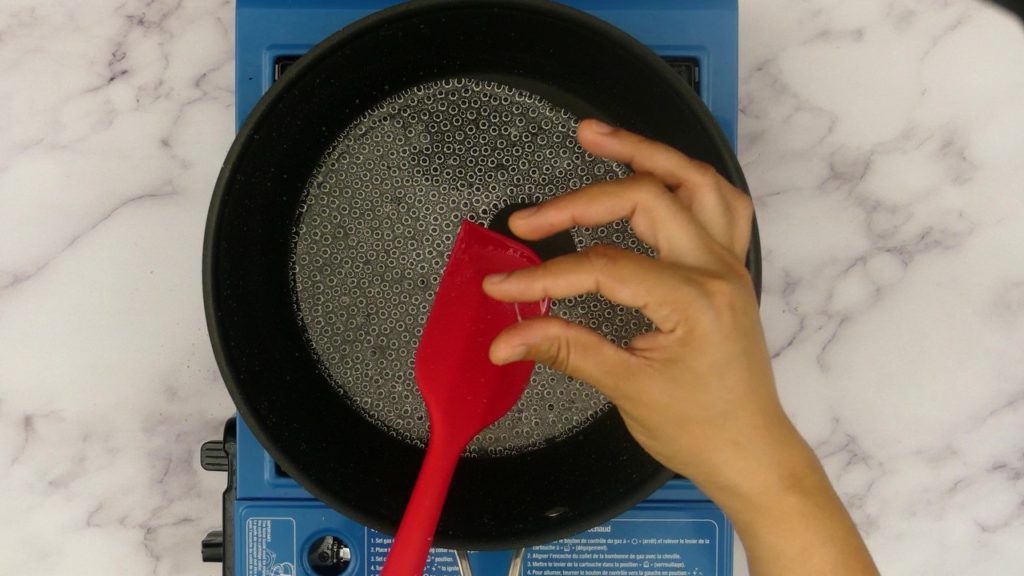 Step 5: To check the consistency, touch the syrup with finger and then touch the finger to thumb, gently pull apart. If the syrup forms a single thread without any break, then one string consistency syrup is ready. Turn off the flame immediately, do not over cook the syrup.
