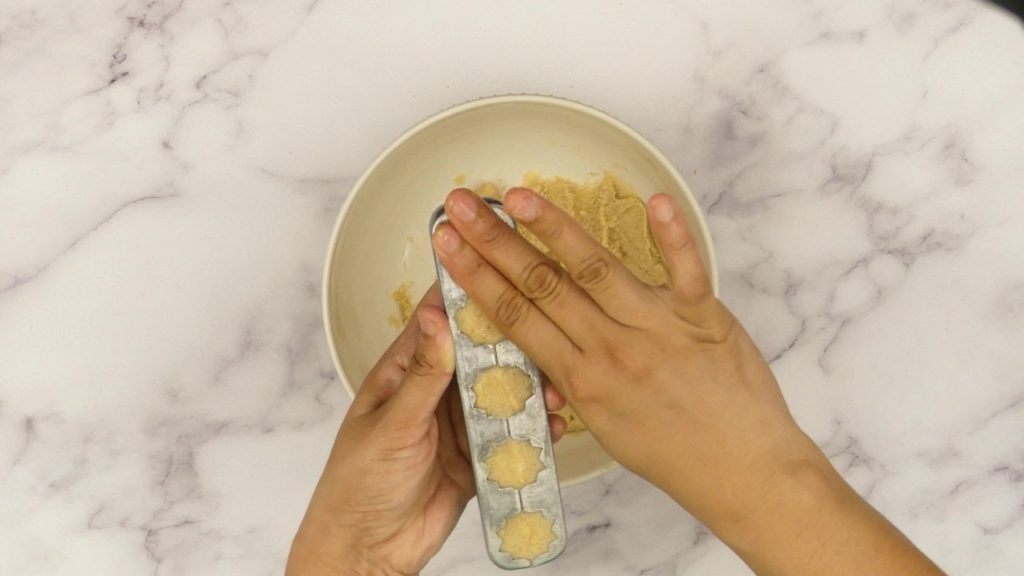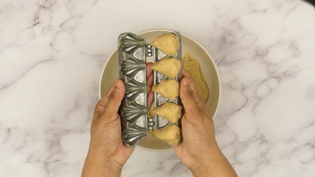 Step 7: Take some mixture and put it into greased modak mould and close it tightly. Remove the excess mixture from mould, press gently. Open the mould and take out Kaju Modak.