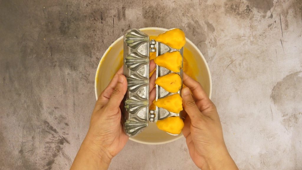 Step 4: Take some mixture and put it into greased modak mould and close it tightly. Remove the excess mixture from mould, press gently. Open the mould and take out Kesar Mawa Modak.
