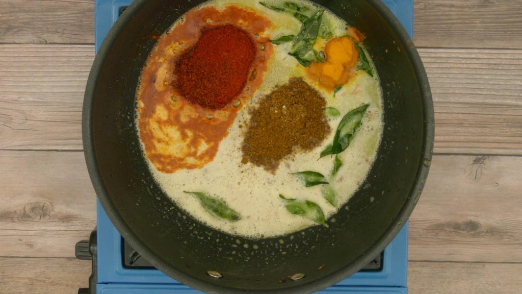 1. In a pan add oil, when oil is hot, add curry leaves, chickpea flour and fry it for a minute. Add red chili powder, turmeric powder and goda masala, fry masala quickly on law flame. Do not let it burn.