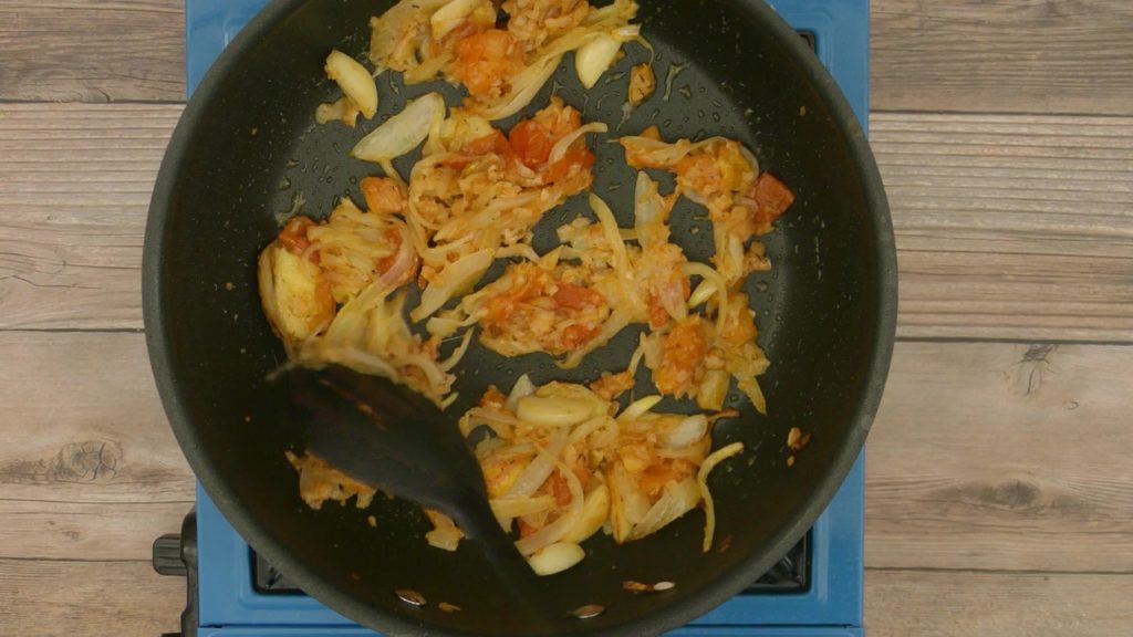 In a pan add oil, when oil is hot, add curry leaves, chickpea flour and fry it for a minute. Add red chili powder, turmeric powder and goda masala, fry masala quickly on law flame. Do not let it burn.