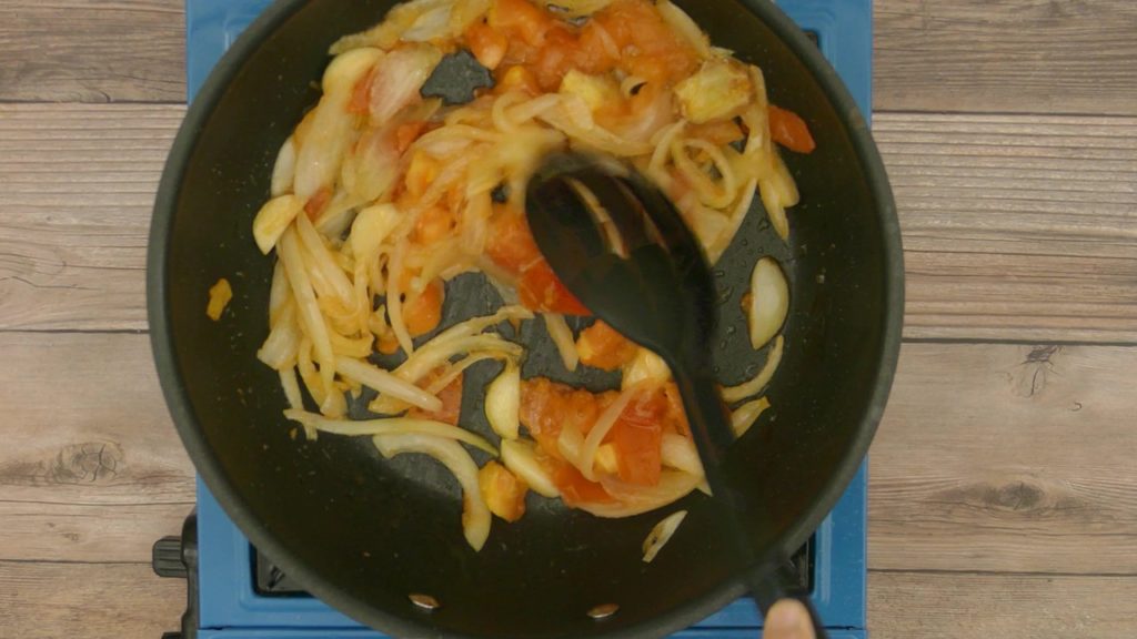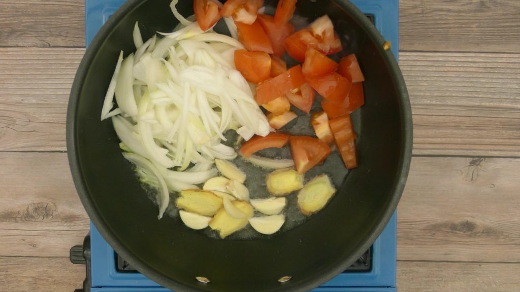 In a pan add oil, when oil is hot, add roughly chopped onions, ginger, garlic and tomatoes. Cook until onions are light brown And tomatoes get soft.