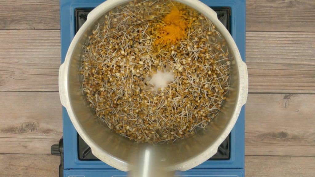 Wash sprouts and drain all the water. Transfer it into cooker, add water, turmeric powder and salt. Cover lid and cook it on medium flame for only 1 whistle.