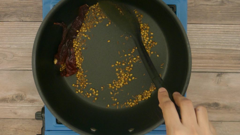1. In a pan add coriander seeds, cumin seeds, red chilis and dry roast on medium flame until golden in color and aromatic. Transfer it in a plate and keep it aside.