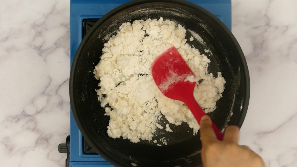 2. Switch off the flame. Add rice flour and stir quickly to combine with the water. Mix until smooth.