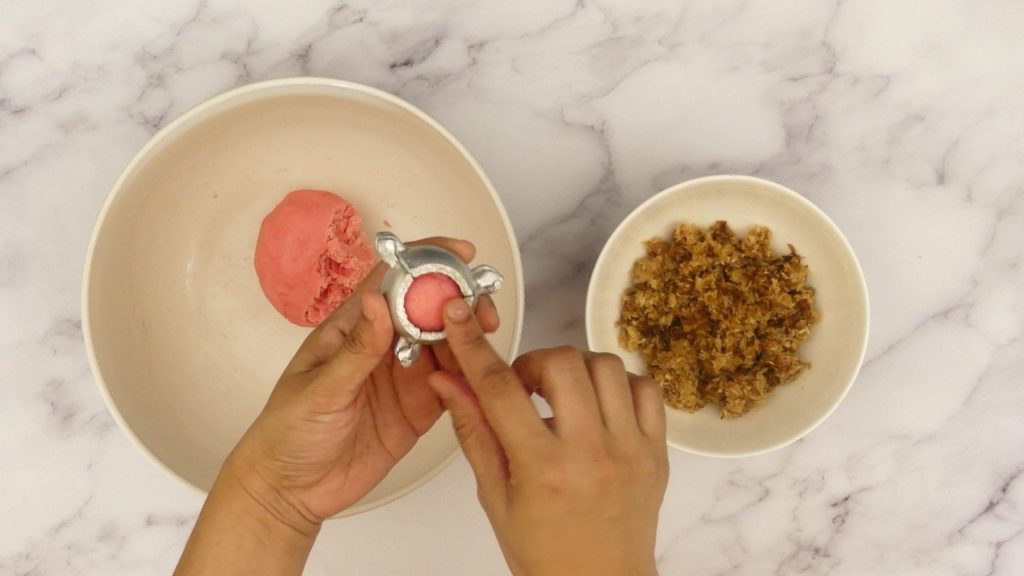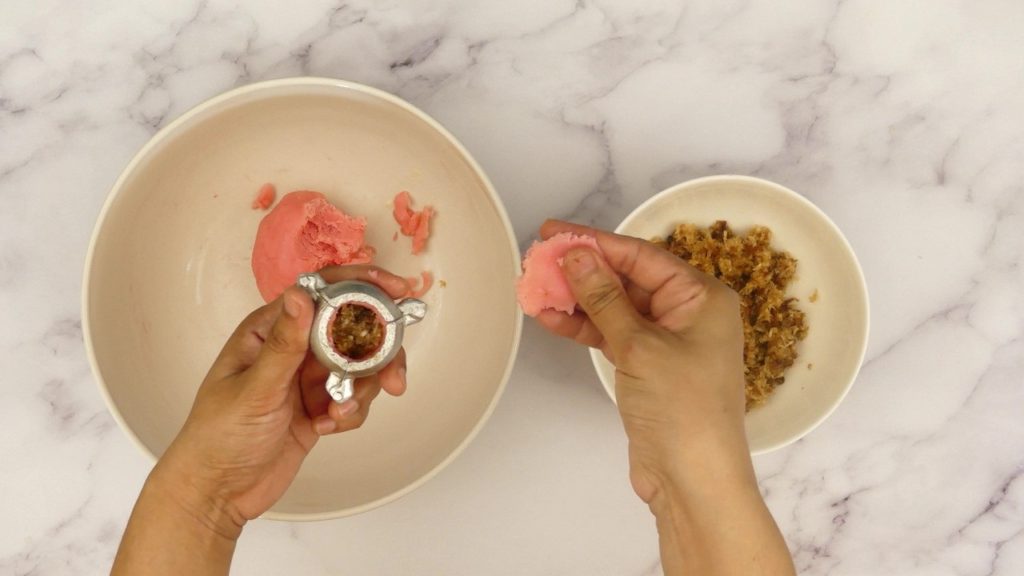 Step 8: Add prepared stuffing inside the mold. Make a small disc of the dough and place it on the base, remove the extra dough, Press it gently and seal the modak.