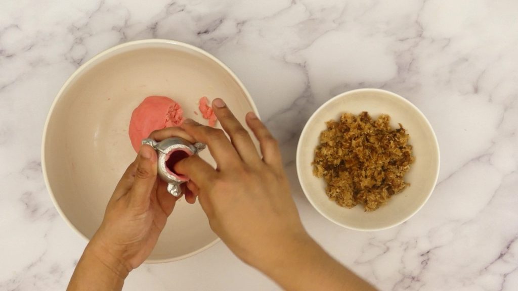 5. Open the mold carefully and remove the modak. Repeat the process for all remaining dough and stuffing.
