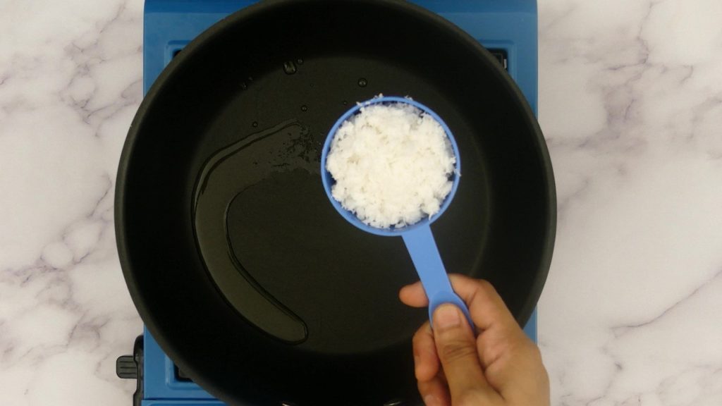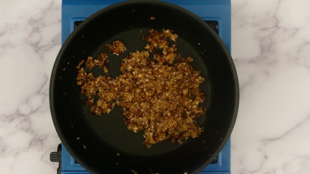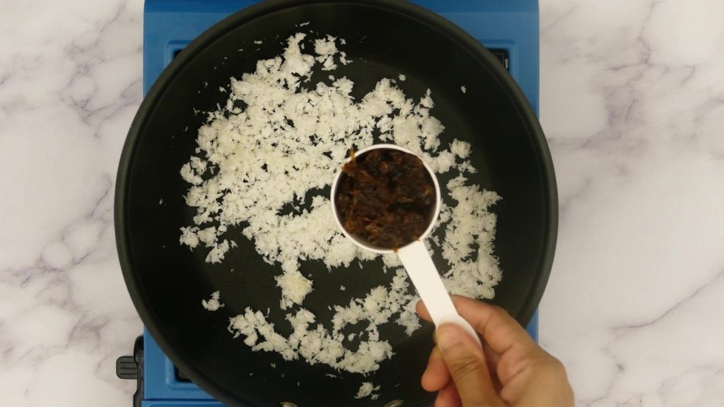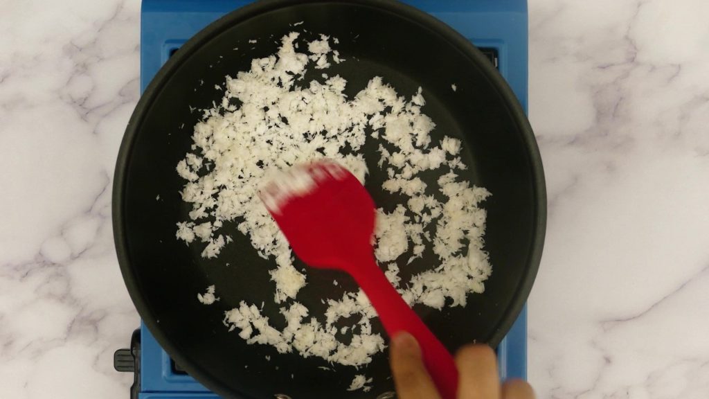 1. Heat 1 tsp ghee in a pan. Add grated coconut and stir on medium flame for 1 minute.