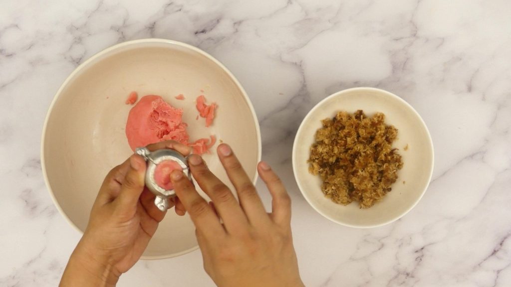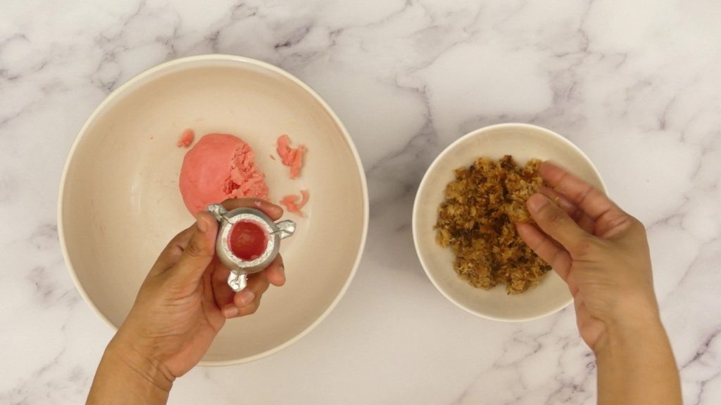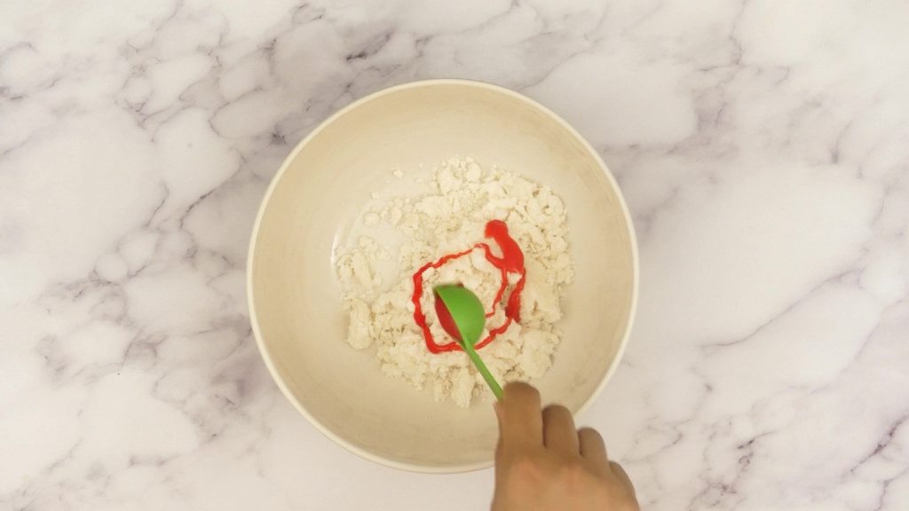 4. After resting, transfer the flour to a bowl. Add 1 tbsp Rooh Afza and mix well.