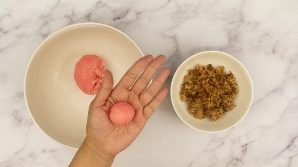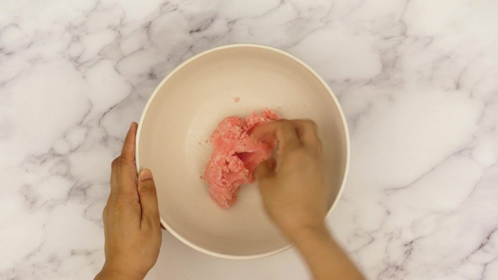 5. Gather the mixture into a dough. Knead it carefully. Wet your palms with water if the dough is hot.