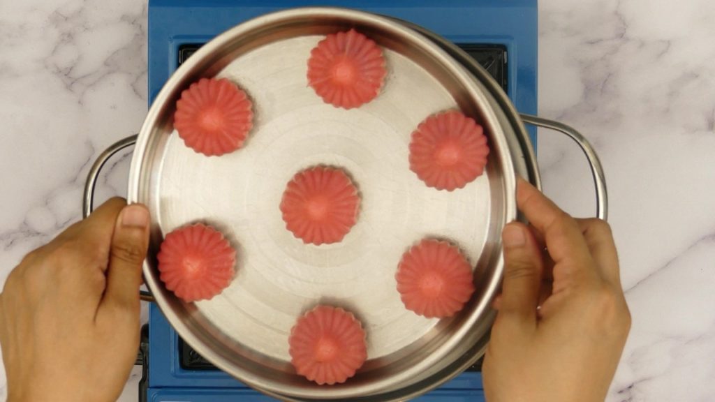 Step 10: Heat up the steamer. Grease the steamer tray with ghee, put all the modaks on tray with a little distance. Put the tray in steamer and steam it on medium flame for 15 minutes.